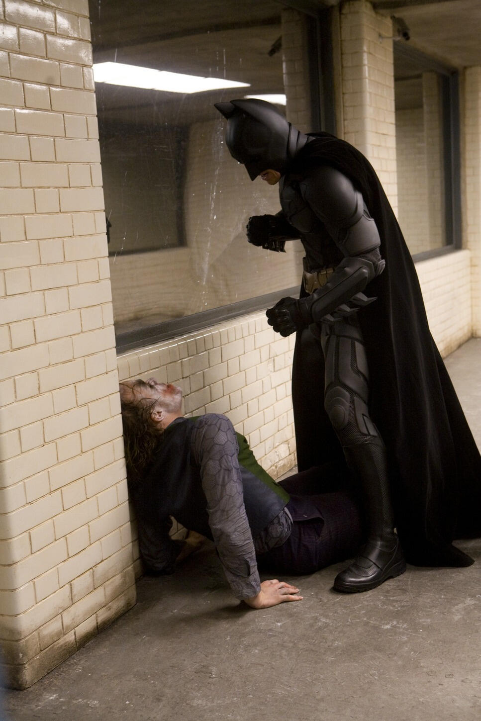 The scene starts between Gary Oldman [as James Gordon] and Heath with the lights out, and [director of photography] Wally Pfister literally just lit the scene with the desk lamp, the table lamp, and nothing else. And then when the lights come on, Batman is revealed, and the rest of the scene plays out with a massive overexposure. He overexposed like five stops, I want to say, and then printed it down to bring some of the color back in. But it’s this incredibly intense overhead light which let us move in any direction. We had a handheld camera and shot however we wanted, be very spontaneous.For me creatively, that had been about inverting the expectation. We’ve all seen so many of these dark movie interrogation scenes where somebody is being given the third degree. We just wanted to completely flip that on its head. And have the bright, harsh, bleak light sort show you the Joker’s make-up and its decay. The Batsuit was redesigned for this film. And unlike the suit that we had in “Batman Begins,” it’s capable of really being shown in incredible detail and still hold up to that kind of scrutiny under that bright light. The suit looked much more real and more like a functional thing this time. The whole scene was about showing something real and brutal and getting this real harshness.GB: There’s remarkable physicality of the actors in that scene. They are such different presences in the room: Christian is all dark mass and bottled fury and Heath has this spindly weirdness. …Nolan: Yes, and I think you start to see it even at the beginning of the scene where everything is in closer. There are tight close-ups with just a little drift to the camera. We start in a very controlled way, but even within that frame, the way Heath is bobbing in and out —and he’s actually bobbing in and out of the focal plane because, you know, it’s very hard to follow someone whose leaning toward camera the whole time. It actually really adds something. We’re continually trying to catch him with the focus. You really see his movement back and forth. That way, even in a tight frame, you have this sense of strangeness. On the other hand, you have Batman sitting there just very, very controlled, restrained as you say. Then there’s a point where it spills over into real physicality and he drags the Joker across the table. We go handheld at that point and shot the rest of the scene with handheld to be very spontaneous in its movement. They had rehearsed the stunts and the fight stuff very specifically, but we really let the actors work within that. I had never seen anybody sell a punch the way Heath was able to with Christian. I got the violence I wanted. What I felt was really important creatively for the scene was that we show Batman going too far. We show him effectively torturing someone for information because it’s become personal.Christian and I had talked a lot on “Batman Begins” about finding a moment in that film where you actually worry that Batman will go too far. A moment where his rage might spill over and he would break his rules. We never found that moment. It just wasn’t there in that story. There was a lot of strength and aggression in the way he played the part, but I don’t think the story provided that element of losing control. What the Joker provides in the second film is the fact that his entire motivation is to push people’s buttons and find their rules set and it turn it on itself. And Batman of course places such importance on his rules, his morals. It’s what distinguishes him, in his mind, from a common vigilante. The Joker is able to twist him around and make him question his own approach and his own actions.GB: In the first film, the Batman’s most memorable moments of intense aggression feel more like theater — he’s doing it in a calculated show to scare people. The first movie seems to be about Batman’s fear; the second one is about his rage.Nolan: Exactly. That’s why we never found that moment of danger, the one we had talked about, where there’s this danger that Batman will just lose it and go too far. That rage is very much a central part of the story in ‘The Dark Knight,’ and that interrogation scene is the fulcrum on which the whole movie turns. I think Batman finds out — and Bruce Wayne finds out — a lot about himself in that scene. I was just delighted to get to see Christian show that rage. And it’s wonderfully balanced with Gary’s control as well. Even though everyone remembers the scene as being the Joker and Batman, Gordon played a very important part to setting it up and allowing this interrogation to happen. And then as he is watching from the sideline, he sees the exact point where this is going too far. He knows Batman well enough to observe this, to recognize it. He tries to get in, but Batman has locked the door. And what we get to lead to, by the end of the scene, when he’s just pounding on the Joker, I think Heath managed to find the exact essence of the threat of the Joker and who he is: He’s being pounded in the face and he’s laughing and loving it. There’s nothing you can do. As he tells Batman, “You have nothing to do with all of your strength.” There’s this sort of impotence of the strong and the armored and the very muscular Batman; he’s very powerful, but there’s no useful way for this power to be exercised in this scene. He has to confront that.Originally, at the end of that scene, once the Joker reveals his information, Christian dropped him and then, almost as an afterthought, he kicked him in the head as he walked out of the room. We wound up removing that bit. It seemed a little too petulant for Batman in a way. And really, more than that, what it was is that I liked how Christian played it: When he drops the Joker, he has realized the futility of what he’s done. You see it in his eyes. How do you fight someone who thrives on conflict? It’s a very loose end to be left with.