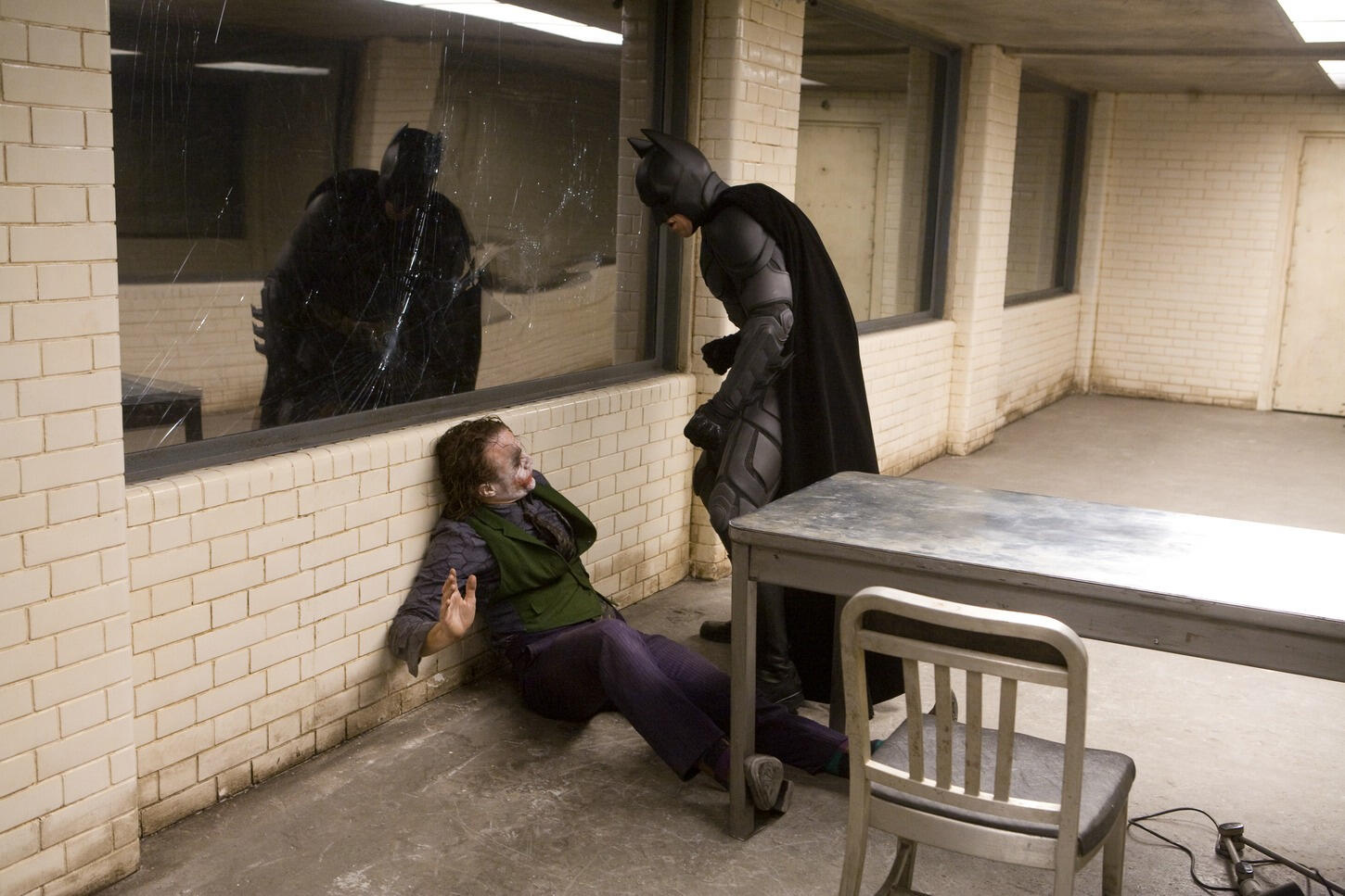 We had a lot of time to shoot it too, because it was so early on. Quite often, as you get behind on other things and you run toward the end of the shoot, things can get very squeezed. But you tend to schedule the first few weeks very generously to give the crew and the actors and myself time to find our feet and find our pace. So we had a couple of days to do it.GB: Can you give me a snapshot memory from those days shooting the scene?Nolan: It was a great set built into a location. It had all of the advantages of feeling that we were in a real place. Nathan Crowley, the production designer, built these great mirrors and this long, tiled room that I really loved the look of; it had the feeling almost of an abattoir or something. That all fed into the brutality of the scene. We wanted to be very edgy, very brutal. We wanted it to be the point at which Batman is truly tested by the Joker and you see that the Joker is truly capable of getting under everybody’s skin. I’m realizing this now about that scene — I haven’t thought this through before — the synthesis of all the different elements that I’m most interested in within filmmaking all come in that scene.